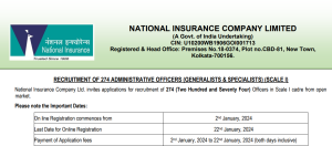 NICL Recruitment 2024 : Name of the Post Administrative Officers (Generalists & Specialists) (Scale I) Total Number of Vacancy 274, NICL Notification 2024, NICL Notification 2024, NICL Application Form PDF Download @nationalinsurance.nic.co.in @ FROM 02.01.2024 TO 22.01.2024