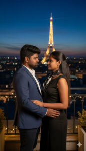 Generate a 4K ultra-HD image of a young couple standing together on a Parisian rooftop, overlooking the Eiffel Tower at night. The man wears a classic navy blazer, and the woman is in a chic black dress with a scarf around her neck. The soft city lights illuminate their faces as they share a quiet, loving glance. The romantic vibe feels cinematic and luxurious.